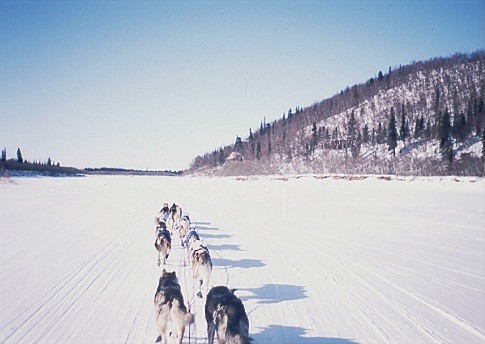 I had heard that the open water along the side of the river at this one certain point was were locals would get water for their dry cabins when they were out here in the winter, so I figured the ice around it must be solid enough. I picked up speed, trying to hurry Nali to the water source.